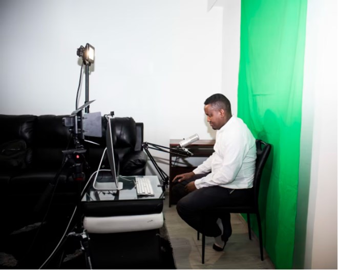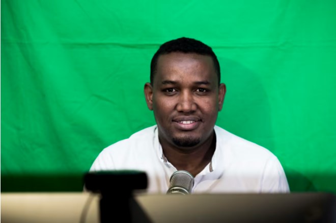 Sitting in front of a makeshift 'green screen' in the living room of a Helsinki apartment, Hassan Kaafi Halane adjusts his microphone as he prepares for the start of a Nato-themed webcast.