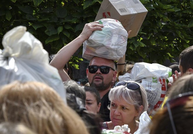 Local residents, many of whom fled the war, gather to hand out donated items such as medicines, clothes, and personal belongings to their relatives on the territories occupied by Russia, in Zaporizhzhia, Ukraine, Sunday, Aug. 14, 2022. Volunteers transport these items across the frontline and distribute them to addresses at their own risk. (AP Photo/Andriy Andriyenko)