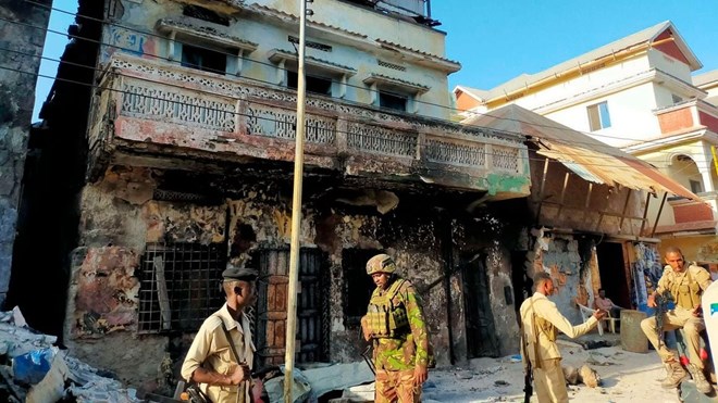 Somali and Atmis troops near a building in Kismayo that was burnt after a generator exploded. Atmis and the Somali security forces are entering the decisive months in the battle against militant group Al-Shabaab. PHOTO | STEVE OTIENO | NMG