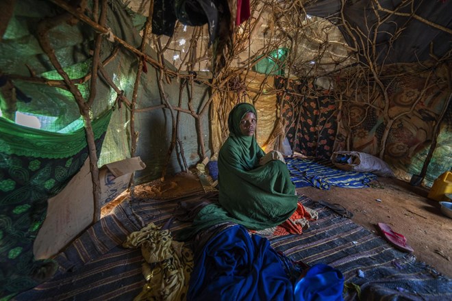 FILE - Fartum Issack sits in a shelter at a camp for displaced people on the outskirts of Dollow, Somalia, Sept. 19, 2022. Issack and her husband carried a small body along a dusty track to a graveyard. Their 1-year-old daughter had arrived at camp sick and hungry. She was rushed for treatment, but it was too late. (AP Photo/Jerome Delay, File)