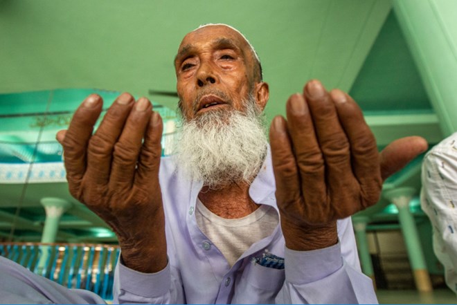 An old Bangladeshi man performs Eid al-Adha prayers at the Baitul Mukarram National Mosque in Dhaka. [Monirul Alam/EPA]