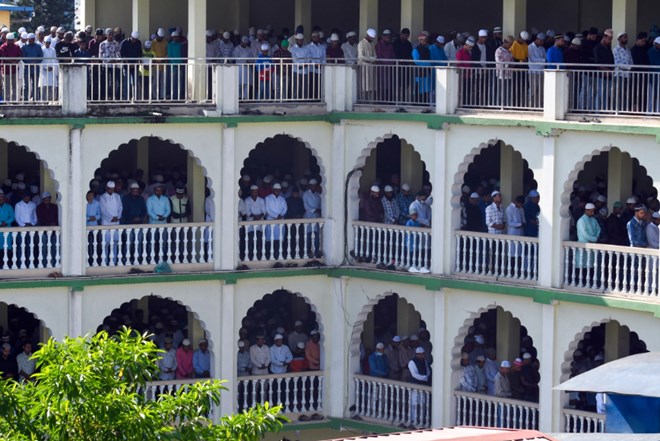 Muslim devotees offer Eid al-Adha prayers at Kashmiri Mosque in Kathmandu, Nepal. [Prakash Mathema/AFP]