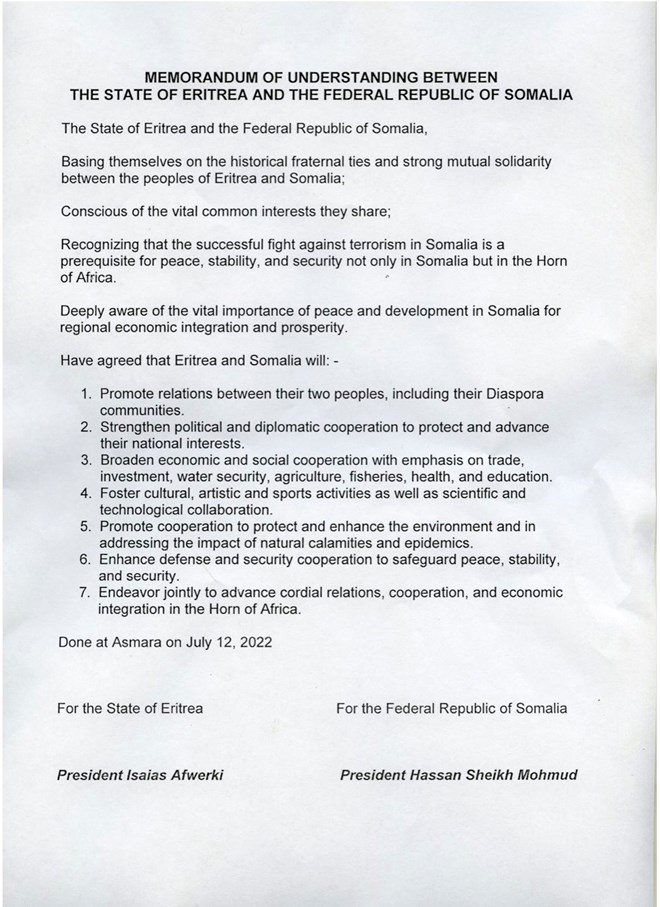 The signing of the seven-point agreement followed bilateral talks between the two Presidents in Asmara on the last day of President Mohamud’s four-day state visit to Eritrea.