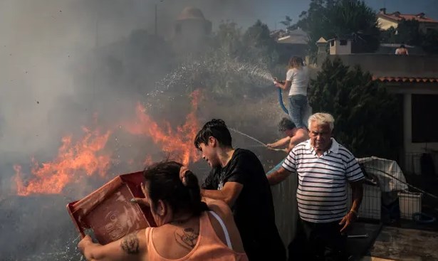 People throw water and spray hoses on flames near their homes in Canecas, on the outskirts of Lisbon. Photograph: Mário Cruz/EPA