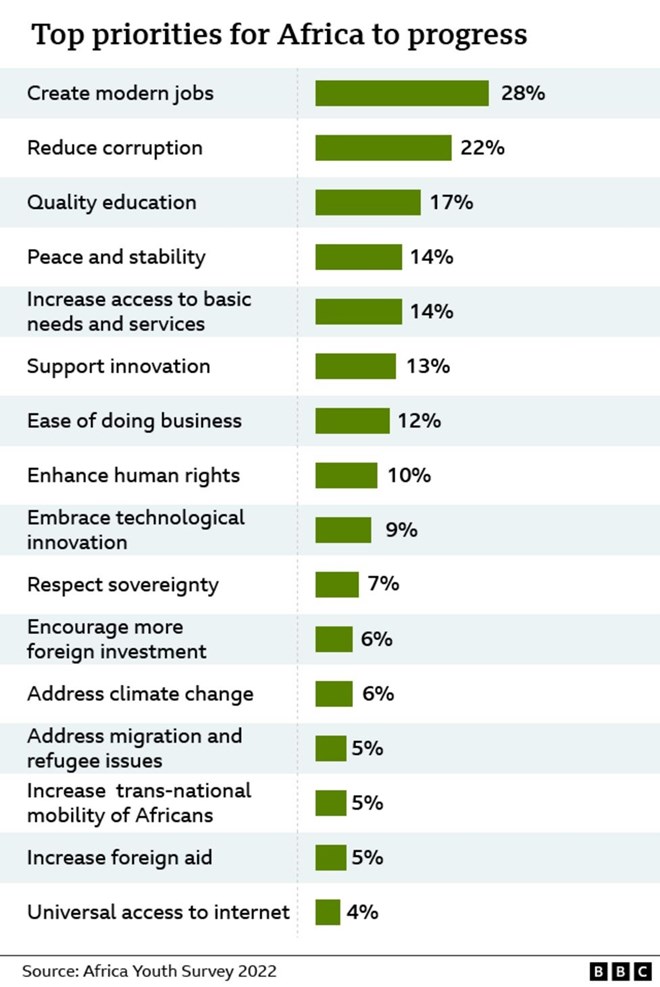 The statistics from the African Youth Survey 2022, carried out in 15 countries by the South African Ichikowitz Family Foundation, back up Mr Oni's pessimism.