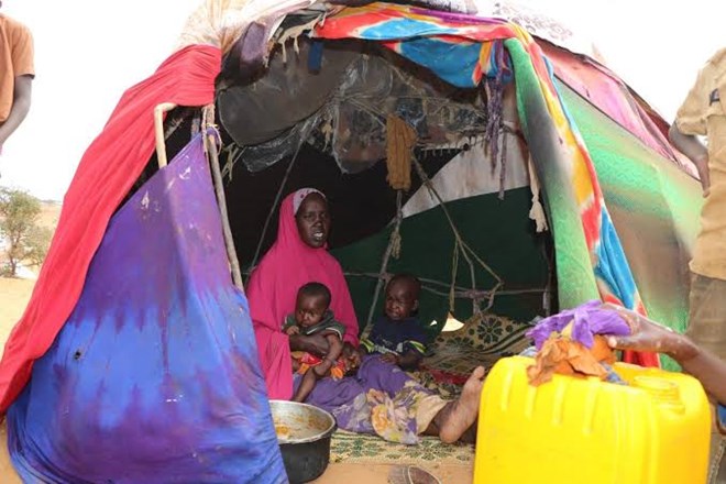 Wrapped in a pink hijab, Rahma Omar sits inside a makeshift shelter made of old clothes, sticks and ropes. It struggles to withstand strong gusts of wind and provides only a little protection from the sun and the heat.