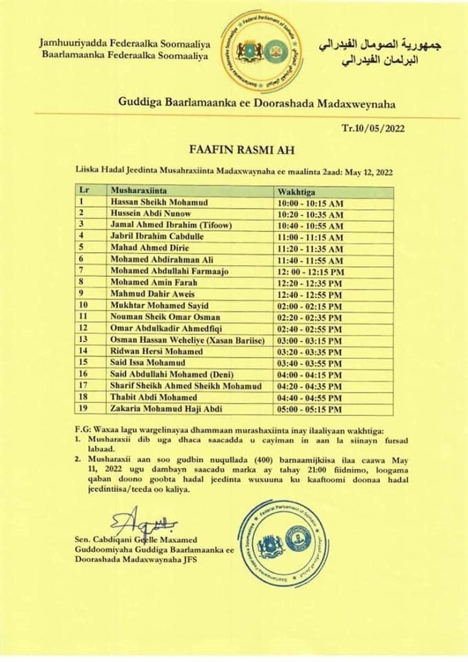 The first candidate to address parliamentarians will be Abdi Adam Hoosow on Wednesday at 10:00 am local time. Former PM Hassan Ali Khaire will be the last candidate to speak on Wednesday at 5:20 am.