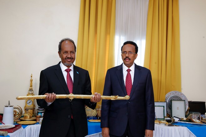 Mogadishu (HOL) - Somalia's outgoing president Mohamed Abdullahi Farmaajo handed over full power to his successor Hassan Sheikh Mohamud in a handover ceremony held at the presidential palace on Monday.