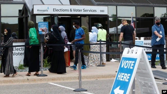 FILE - Voters, among them Somali Americans, line up to cast their ballots in primary elections, at the Minneapolis Election and Voters Services offices, in Minneapolis, Minnesota, Aug. 10, 2020.