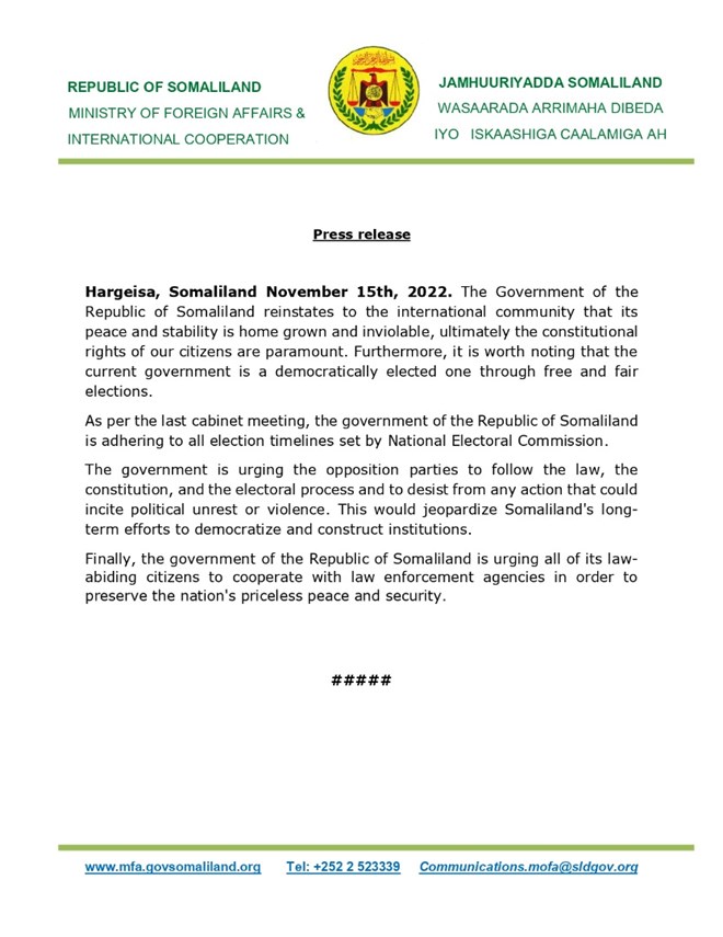 In a statement issued on Tuesday, Somaliland's Ministry of Foreign Affairs, the government urged opposition parties "to follow the law, the constitution and the electoral process and desist from any action that could incite political unrest or violence."