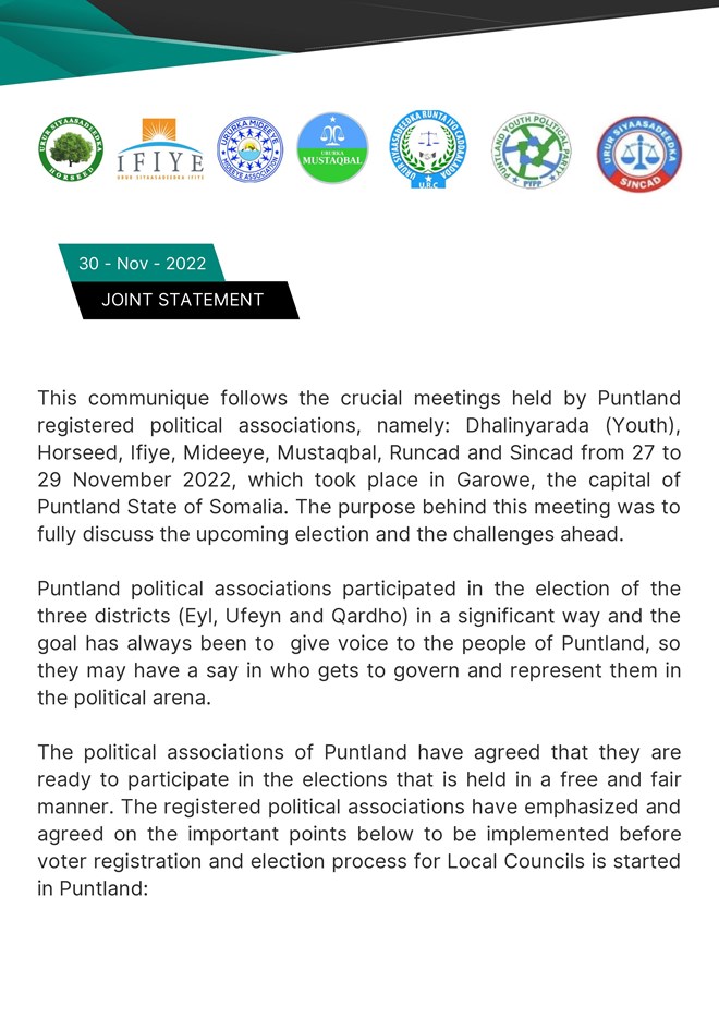 Seven parties - Dhalinyarada, Horseed, Ifiye, Mideeye, Mustaqbal, Runcad, and Sincad - signed a joint communique following an election meeting in the regional capital."The political associations of Puntland have agreed that they are ready to participate in the elections that are free and fair. The registered political associations have emphasized and agreed on the important points below to be implemented before voter registration and election process for Local Counsils is started in Puntland."