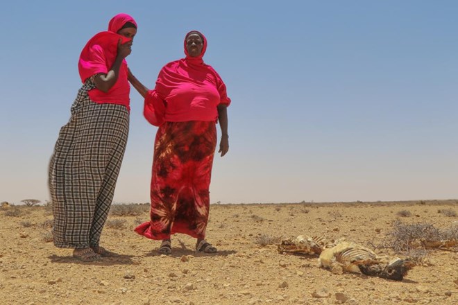 Two women stand beside the carcass of one of their goats in the Nugal region of northern Somalia. Photo: Abdulkadir Mohamed/NRC