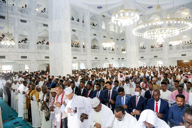 Mogadishu (HOL) - Somali President Hassan Sheikh Mohamud performed the Eid Al Adha prayer on Saturday morning alongside Prime Minister Hamza Barre, MPs, government officials and hundreds of people at the newly constructed Ali Jimale Mosque in Mogadishu.