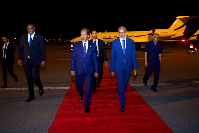 Djibouti (HOL) - Somali President Hassan Sheikh Mohamud arrived in Djibouti on Friday for the 41st extraordinary session of the IGAD Assembly of Heads of State and Government in Djibouti City.