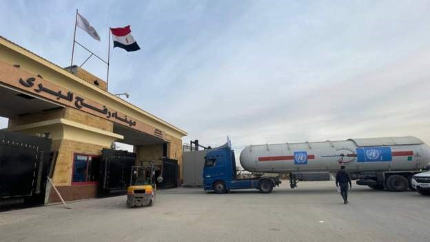 A fuel tanker waits to cross at the Egyptian side of the Rafah border crossing with Gaza on Sunday
