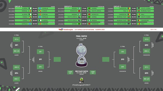CAF has released the full schedule of the TotalEnergies U17 African Cup of Nations Algeria 2023 that will be played between 29 April and 19 May 2023.