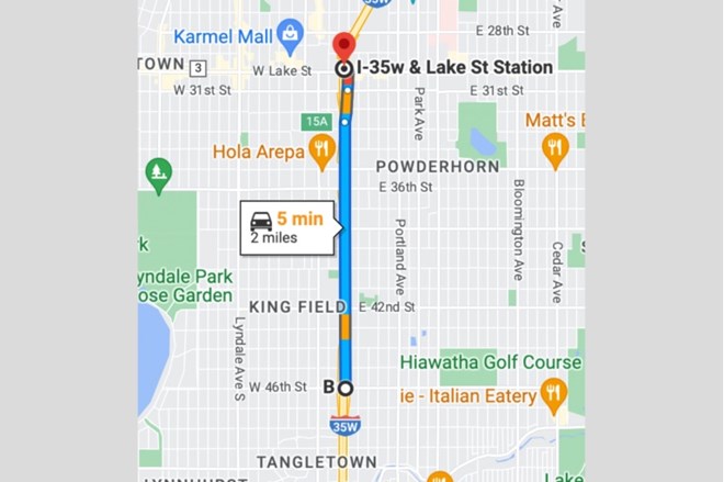Five young women were killed when a driver ran a red light and struck their car on Friday, June 16, 2023. A State Patrol trooper first saw the suspect driver speeding northbound on Interstate 35W and followed him from the 46th Street exit to the Lake Street exit, where the suspect left the interstate and struck the women. Credit: Google Maps