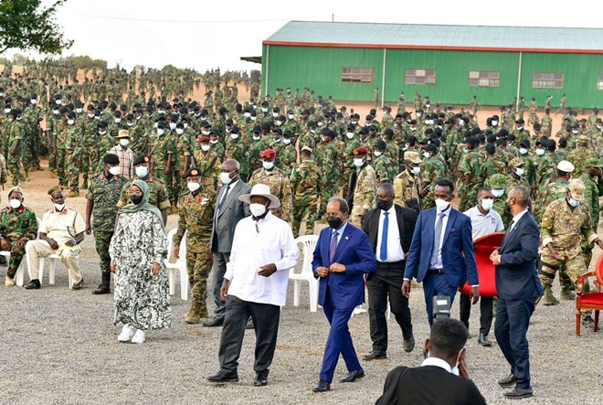 While in Uganda, President Mohamud alongside his Ugandan counterpart also witnessed the passing out of 2,900 trainees for the Somali National Army who successfully concluded their 4-month special Basic Military Training at the Special Mission Training Centre in Butiaba, Buliisa District.