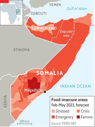 This hunger is the deadliest in Somalia since the famine of 2010-11, which claimed 260,000 lives. And it will get worse before it gets better. Researchers at the London School of Hygiene and Tropical Medicine, whose modelling underpins the report, project that in the coming months 135 people will die every day from drought-related causes. The Integrated Food Security Phase Classification (ipc), a un affiliate that measures hunger, reckons that 6.5m Somalis will face “crisis”, “emergency” or “catastrophe” levels of food insecurity between April and June.The drought is the worst in the region for 40 years. Its barren shadow stretches beyond Somalia and into Kenya, Djibouti and Ethiopia, where millions more go hungry. Dry spells in the Horn of Africa are linked to La Niña, a temporary cooling in the Pacific Ocean that affects weather patterns worldwide, and which is only now relenting after three stubborn years. Its impacts may have been amplified by climate change, although the people of Somalia can hardly be blamed for that. They have emitted roughly as much carbon dioxide since independence in 1960 as Americans have in the past two and a half days.