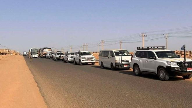 A convoy leaving Khartoum advances on a road towards Port Sudan, on April 23, 2023. PHOTO | ABUBAKARR JALLOH | AFP
