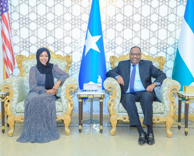 FILE - U.S. Congresswoman Ilhan Omar (L) seated with Puntland President Said Abdullahi Deni during a visit to the Puntland state capital, Garowe, on December 22, 2022. CREDIT: Puntland State House
