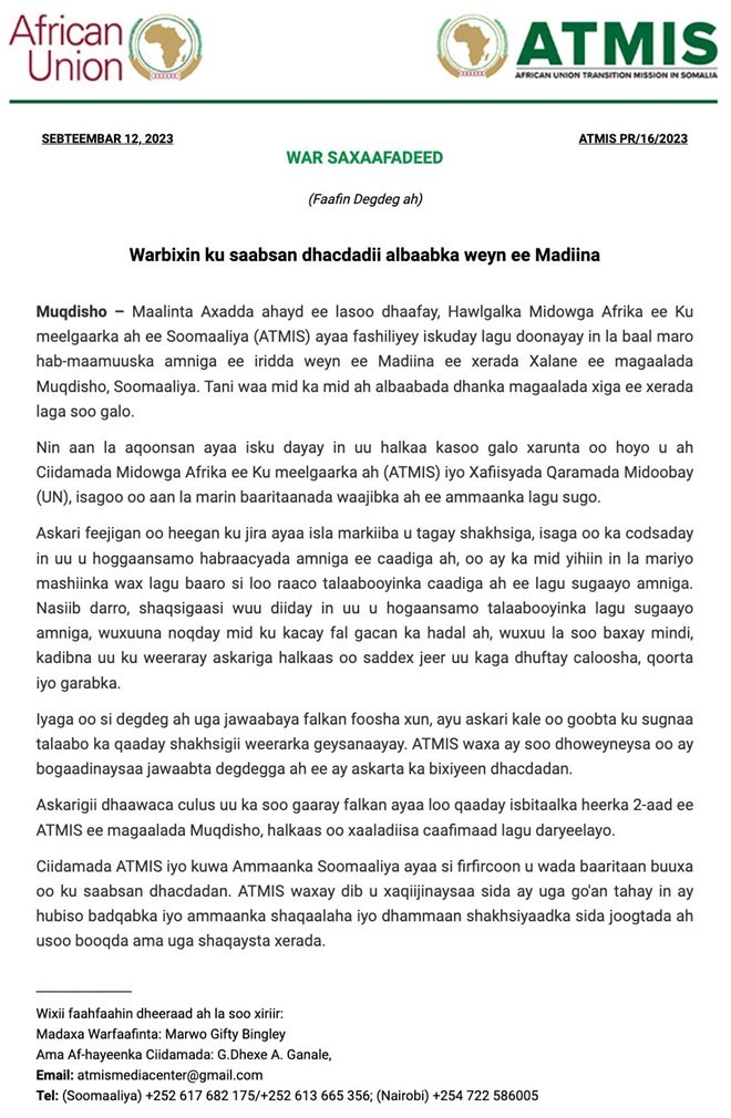 “A vigilant soldier on duty promptly approached the individual, requesting compliance with standard security procedures, including passing through the security scanner for routine security checks. Unfortunately, the individual declined to cooperate and became violent, brandished a knife, and attacked the soldier stabbing him three times on the stomach, the neck and the shoulder,” the statement said.“In a swift response to the immediate threat, another soldier stationed at the access point neutralised the individual responsible for the attack. ATMIS acknowledges and commends the swift actions of the soldiers involved in this incident,” the statement added.