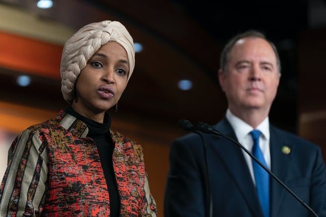 Rep. Ilhan Omar, D-Minn., with Rep. Adam Schiff, D-Calif., right, speaks during a news conference on Capitol Hill in Washington on Wednesday. Manuel Balce Ceneta/ AP