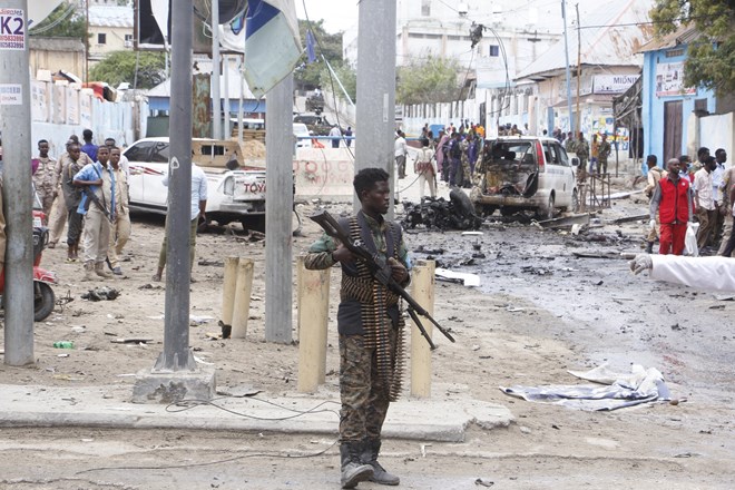 A Somali soldier secures the area after a car bomb attack at a Presidential Palace checkpoint in Mogadishu, Somalia, Sept. 25, 2021. (AP File Photo)
