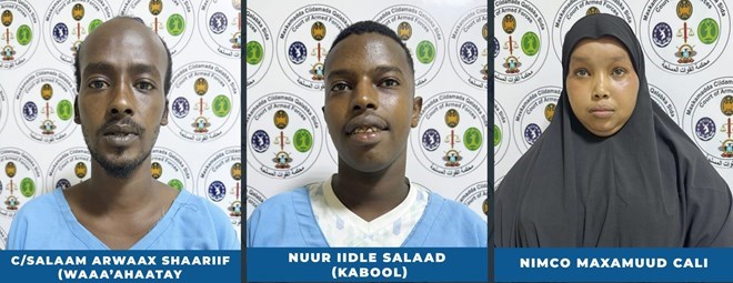 MOGADISHU (HOL) — A Military Court in Mogadishu has sentenced four individuals, including security officials, to prison for their involvement in a series of armed robberies and alcohol consumption. Second Inspector Aslub Noor Idle Salad, Constable Abdisalan Arwah Sharif, and Constable Mohamed Nur Ahmed received an eight-year sentence. Nimco Mohamud Ali, the only woman in the group, was sentenced to five years in a military prison.