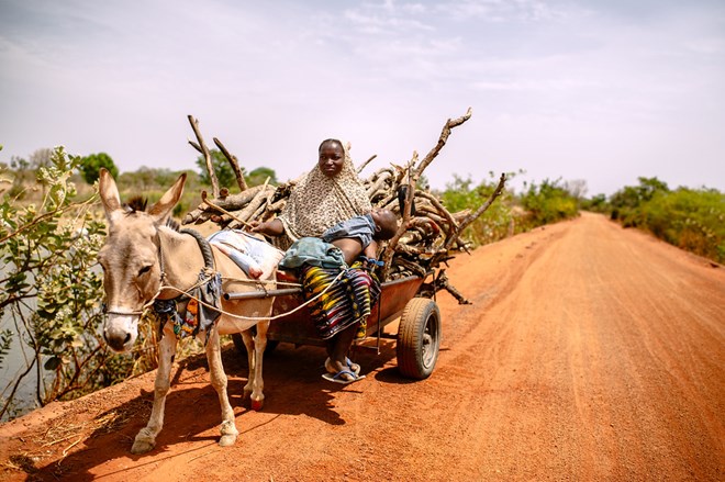 FILE - A woman drives a donkey cart loaded with firewood back to the Zorro village, Burkina Faso.