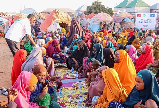 Millions of Somalis displaced by conflict or the climate crisis live in overcrowded informal camps in and around the capital, Mogadishu. Here, some wait to receive an Iftar meal during Ramadan, on 22 March 2024. Hodan Mohamed Abdullahi/Anadolu