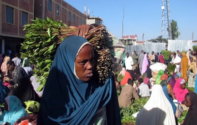 A woman carries a bundle of khat at a bustling market in Ethiopia, highlighting the crop's critical role in the livelihoods of many communities despite ongoing economic challenges and trade disruptions