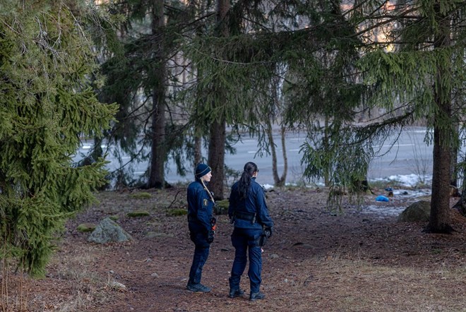 Police officers search the wooded area in Märsta where Nimo Bashir Daud’s body was discovered. Photo: Magnus Wennman