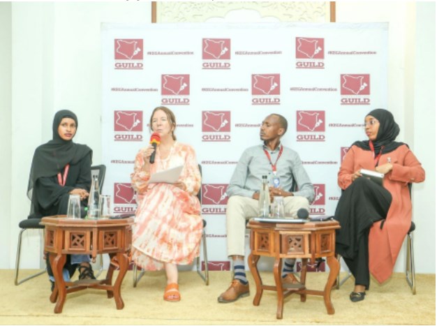 Climate Change Reporting panelists at the Kenya Editors Convention in December 2023. From Left: Fakat Kiin, a Reporter with Bilan Media (Somalia), Mary Harper (UNDP), Adrian Topoti (Base Titanium) and Faiza Mohammed a climate activist and Youth Representative from Somalia.