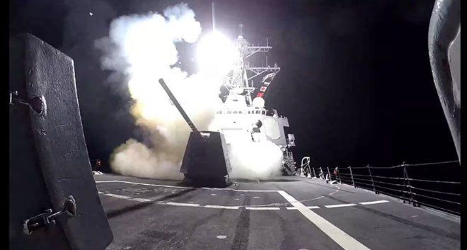 A Tomahawk land attack missile (TLAM) is launched from the U.S. Navy Arleigh Burke-class guided missile destroyer USS Gravely against what the U.S. military describe as Houthi military targets in Yemen, February 3, 2024. U.S. Central Command/Handout via REUTERS. Purchase Licensing Rights
