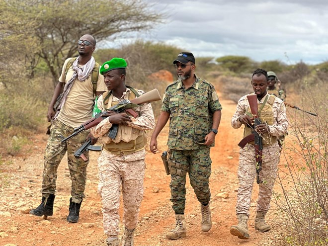 Somali National Army (SNA) soldiers conduct a patrol near Beerayabaal in the Hiiraan region during an operation against Al-Shabaab fighters on Saturday afternoon.