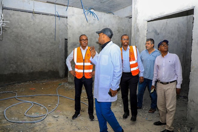 Commissioner Mahamuud Moallim Abdulle tours the new emergency assistance center in Mogadishu, which includes a trauma center, ahead of its imminent opening. The facility, nearing completion, is designed to enhance disaster response and provide immediate aid to those in need. CREDIT/ SoDMA