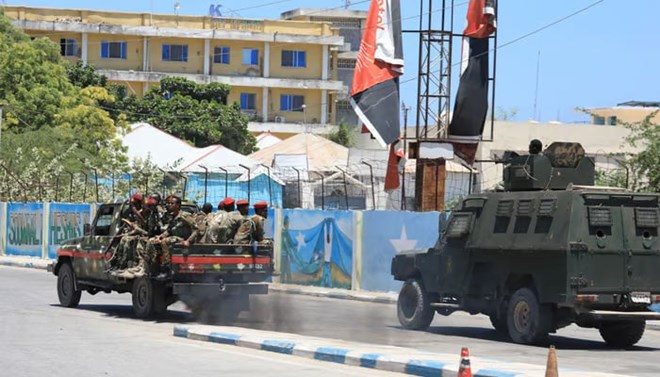 An armoured personnel carrier (APC) drives in a street near a hotel in Mogadishu on March 15, 2024. —AFP