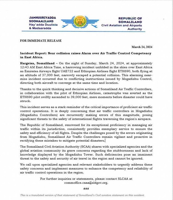 According to Somaliland's Civil Aviation And Airport Authority a "harrowing" occurrence of a possible near collision was averted by the quick reaction of Somaliland's ATC Controllers (see their report below).