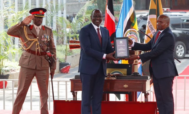 Kenya's President William Ruto hands over the Kenyan constitution to Deputy President Kithure Kindiki after he took the oath of office during his swearing-in ceremony, Nov. 1, 2024.