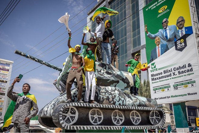 Supporters of the ruling Kulmiye party dance and chant party slogans on top of a monument depicting a tank following a final campaign rally in Hargeisa on November 9, 2024, ahead of the 2024 Somaliland presidential election. (AFP)