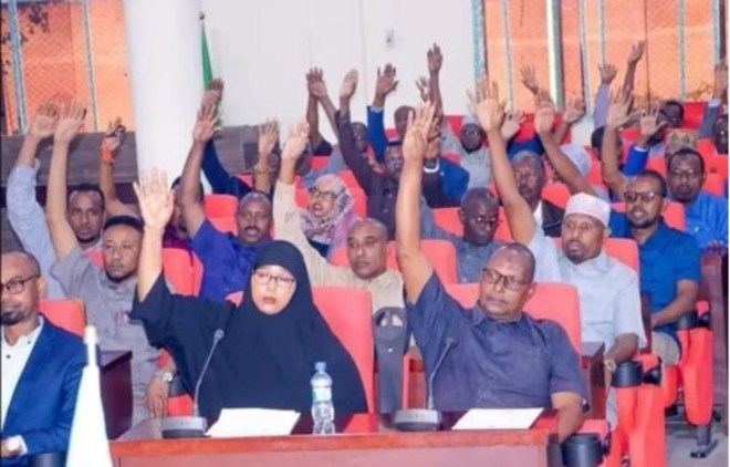 FILE - Jubaland lawmakers raise their hands to cast votes during a parliamentary session in Kismayo, marking a critical step in the region's leadership elections amidst tensions with Somalia's federal government.