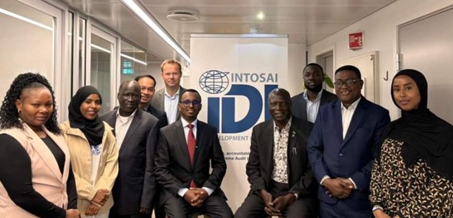 Somalia’s Auditor General Ahmed Issa Gutale (center, red tie) pictured with fellow delegates during a meeting with the International Organization of Supreme Audit Institutions (INTOSAI) on collaborative efforts to enhance public financial oversight and governance reforms.