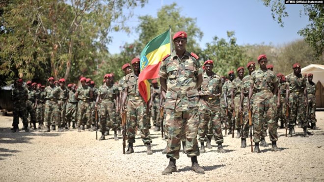 FILE - Ethiopian soldiers from the African Union Transition Mission in Somalia (ATMIS) stand in formation. Officials from Somalia's South West and Jubaland regions have expressed opposition to the planned withdrawal of Ethiopian troops by the end of the year. Credit: ATMIS