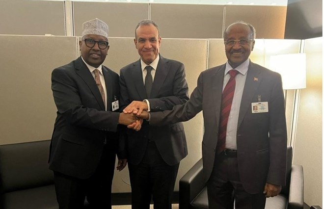 Somalia's Foreign Minister Ahmed Moalim Fiqi, Egypt's Foreign Minister Badr Abdelatty, and Eritrea's Foreign Minister Osman Saleh join hands during their trilateral meeting on the sidelines of the United Nations General Assembly, underscoring their commitment to regional stability and cooperation. Credit. Egypt MOFA