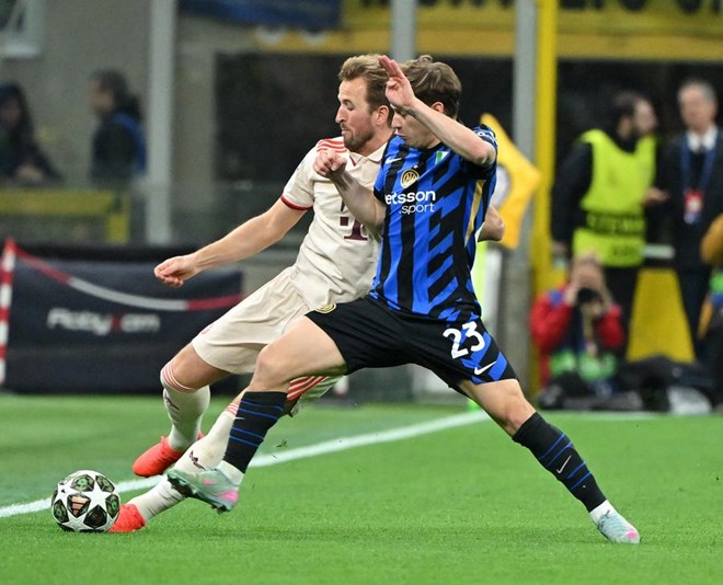 Inter Milan's Nicolo Barella (R) vies with Bayern Munich's Harry Kane during the match in Milan, Italy, April 16, 2025. (Photo by Alberto Lingria/Xinhua)