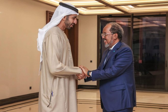 Somali President Hassan Sheikh Mohamud shakes hands with UAE Minister of State for Foreign Affairs Sheikh Shakhboot bin Nahyan Al Nahyan during a meeting in Mogadishu on August 27, 2025. CREDIT/ SONNA