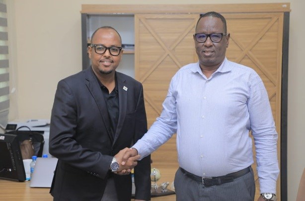 Somali Football Federation (SFF) President Ali Abdi Mohamed (R) shakes hands with newly appointed Referees Committee Chairman Wiish Yabarow (L), signalling a move towards unity and leadership stability within Somali football. (Photo by Abdulkadir Muse Osman)