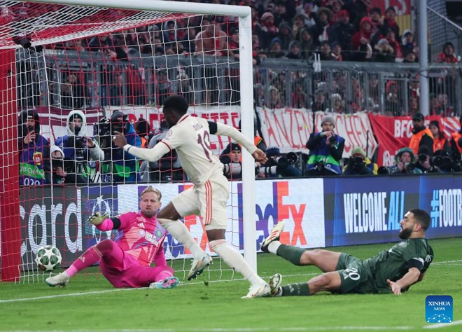 Alphonso Davies (C) of Bayern Munich shoots to score during the UEFA Champions League knockout phase play-off second leg football match between Bayern Munich and Celtic FC in Munich, Germany, Feb. 18, 2025. (Photo by Philippe Ruiz/Xinhua)