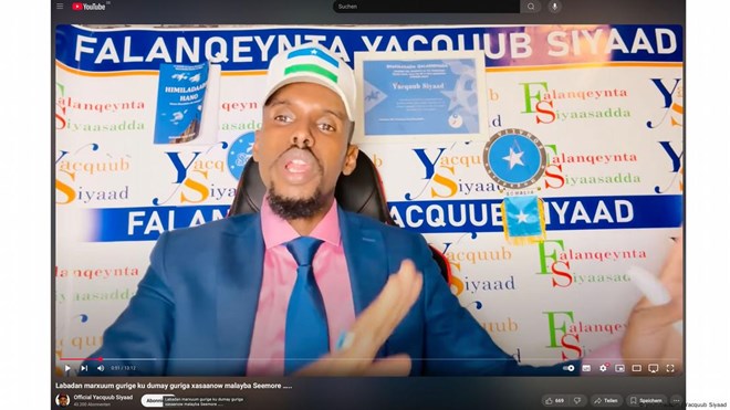Currently, he is back in Germany. Returning to Somalia does not appear to be a viable option for Yacqwub — he would risk being arrested upon arrival. In January 2025, a Puntland military court sentenced him in absentia to 10 years in prison on charges of using his YouTube channel to spread disinformation. The circumstances that led to this verdict are unclear.